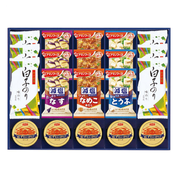 白子のり味のり(8切5枚)6袋・減塩いつものおみそ汁(なす9g・とうふ10.3g・なめこ8g各3袋)・紅ずわいがにほぐし身55g×5缶