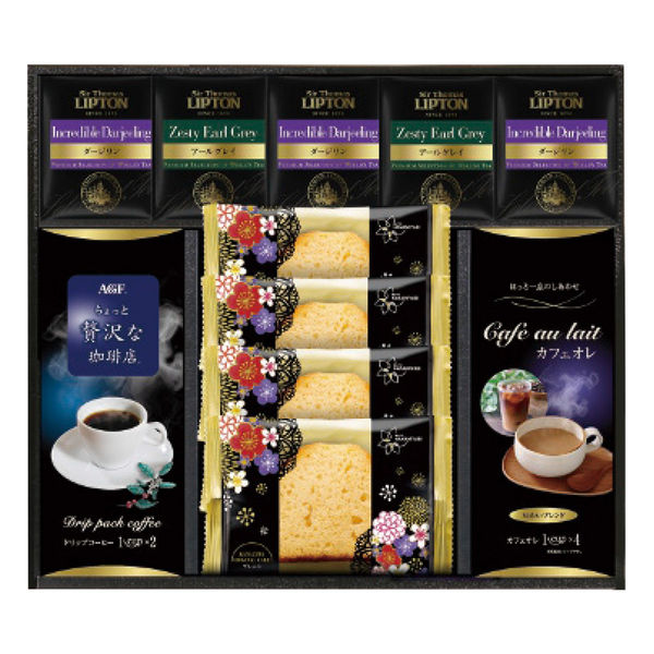 AGFちょっと贅沢な珈琲店スペシャルブレンド(7g×2袋)・カフェオレ(12g×4袋)各1箱・サー・トーマス・リプトンティーバッグ(ダージリン2.2g×3個・アールグレイ2.1g×2個)・金澤兼六製菓オリジナルケーキ(プレーン)4個
