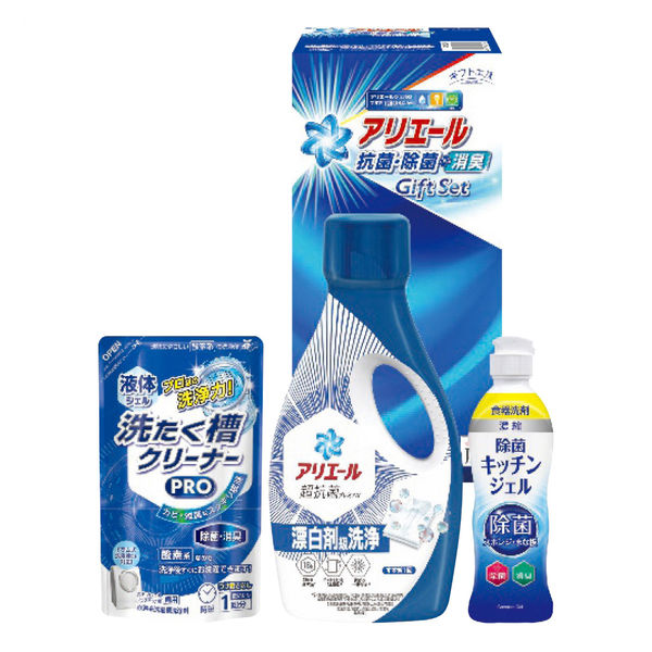 | 商品の特徴 | 抗菌洗剤アリエールと、少量でたくさん洗える濃縮タイプの食器洗剤除菌ジェル、洗たく槽クリーナーのギフトです。 | ||