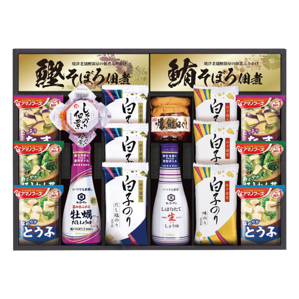 - 白子だし塩のり(8切5枚)・白子味のり(8切5枚)各3袋・アマノおみそ汁(なす9.5g・ほうれん草7g・とうふ10g各2袋)・島の香しそのり佃煮80g・ニッスイ焼鮭ほぐし50g各1瓶・鰹そぼろ佃煮(5g×3袋)・鮪そぼろ佃煮(5g×3袋)各1箱・キッコーマン牡蠣だししょうゆ・キッコーマンしぼりたて生しょうゆ各1本・各200ml