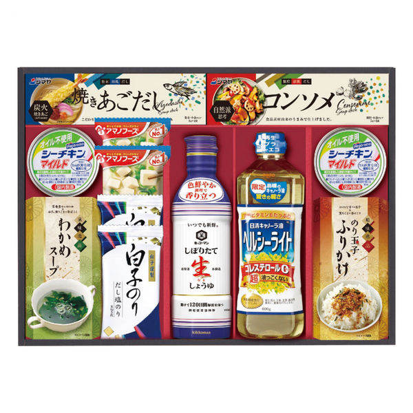| 商品仕様 | アマノとうふおみそ汁10g・白子だし塩のり(8切5枚)各2袋・はごろもフーズオイル不使用シーチキンマイルド70g×2缶・シマヤ焼きあごだし(8g×4袋)・シマヤ自然派思考コンソメ(5g×4袋)・わかめスープ(5.3g×2袋)・のり玉子ふりかけ(4.5g×2袋)各1個・キッコーマンしぼりたて生しょうゆ450ml・日清ヘルシーライト600g各1本 | 表示すべきアレルギー項目 ※お手元に届いた商品を必ずご確認ください | 卵・乳成分・小麦・えび・ごま・さば・大豆・鶏肉・豚肉・魚介類 |