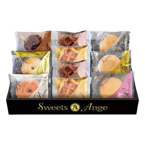 | 商品の特徴 | パールシュガーをつけてこんがり焼き上げたベルギーワッフル、ふんわりとした生地にクリームを挟んだブッセ、揚げずに焼いたベイクドドーナツ。スイーツアンジュの焼菓子アソートです。 | ||