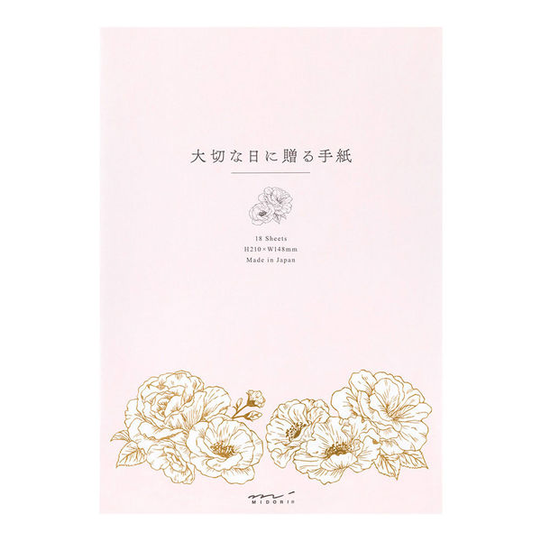 | 商品の特徴 | 人生の特別なときに気持ちを伝える「大切な日に贈る手紙」 の便箋。織物のような格子状の凹凸が感じられるしっかりとした紙の素材感と箔押しの上質感が大切な日に気持ちを伝えるのにぴったり。白色度の高いミドリオリジナル用紙を使用、筆記具を選ばずにご使用いただけます。表裏2種(横罫幅10mm、13mm)の罫線下敷付き。鉛筆で描いたような繊細な線画モチーフの箔押しが書いた文字に寄り添います。「花柄」は「愛情、感謝、希望」の思いを込めたバラモチーフでシーンを選ばない華やかなデザインです。 | ||