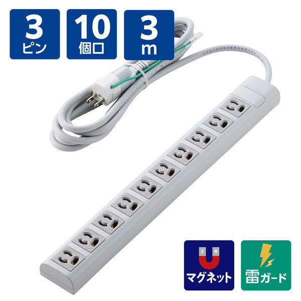 延長コード 電源タップ 3ピン 10個口 3m マグネット 抜け止め 2ピン変換アダプター付 T-H31030NM エレコム 1個(直送品)