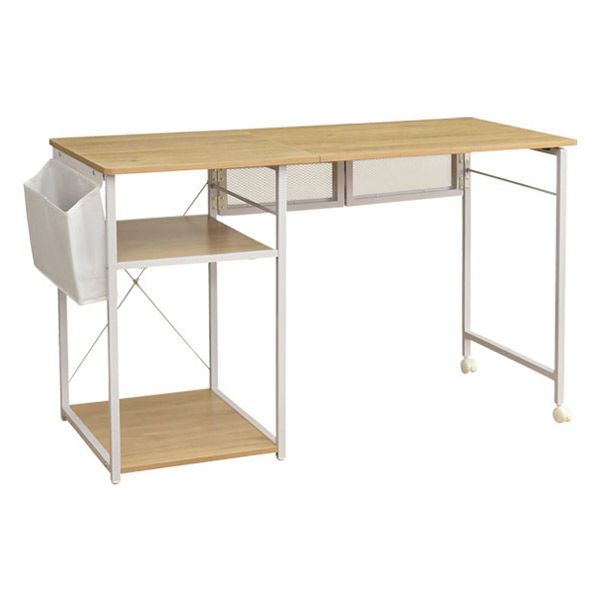 | 商品の特徴 | バタフライ式で簡単に折りたたみできるデスク。使う時だけデスクに、普段は3段ラックとして使用可能です。汚れや熱に強いメラミン化粧繊維板を採用し、サッと拭き取れます。小物収納バッグ付きで、アジャスターがガタつきを防止し床も傷つけません。リビング学習や作業台に活躍し、総耐荷重80kg、各棚20kgでプリンターも置けます。 | ||