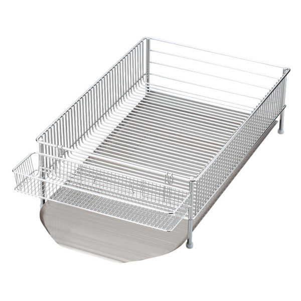 | 商品の特徴 | ●メイドインジャパンを誇れる美しく使いやすい水切りカゴです。●食器の出し入れがしやすいように浅型構造。●底のワイヤーは交差が無く、シンプルなデザイン。●ワイヤーのピッチが細かくフラットなので、皿も立てやすく、グラスを置いても安定します。●トレーは水が流れる構造で清潔です。●長い箸や包丁を安全に、しっかりと水切りできるポケット付きです。 | ||