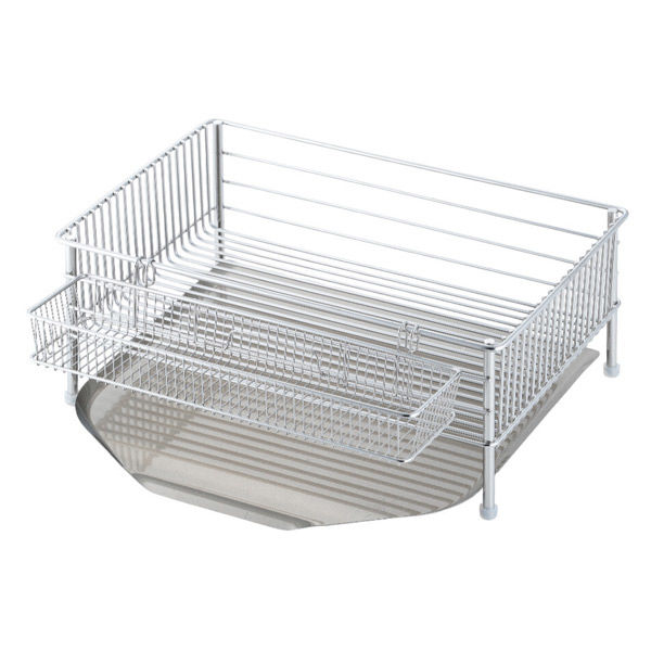 | 商品の特徴 | ●メイドインジャパンを誇れる美しく使いやすい水切りカゴです。●食器の出し入れがしやすいように浅型構造。●底のワイヤーは交差が無く、シンプルなデザイン。●ワイヤーのピッチが細かくフラットなので、皿も立てやすく、グラスを置いても安定します。●トレーは水が流れる構造で清潔です。●長い箸や包丁を安全に、しっかりと水切りできるポケット付きです。 | ||