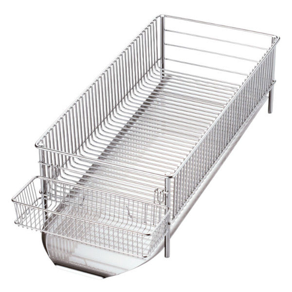 | 商品の特徴 | ●メイドインジャパンを誇れる美しく使いやすい水切りカゴです。●食器の出し入れがしやすいように浅型構造。●底のワイヤーは交差が無く、シンプルなデザイン。●ワイヤーのピッチが細かくフラットなので、皿も立てやすく、グラスを置いても安定します。●トレーは水が流れる構造で清潔です。●長い箸や包丁を安全に、しっかりと水切りできるポケット付きです。 | ||