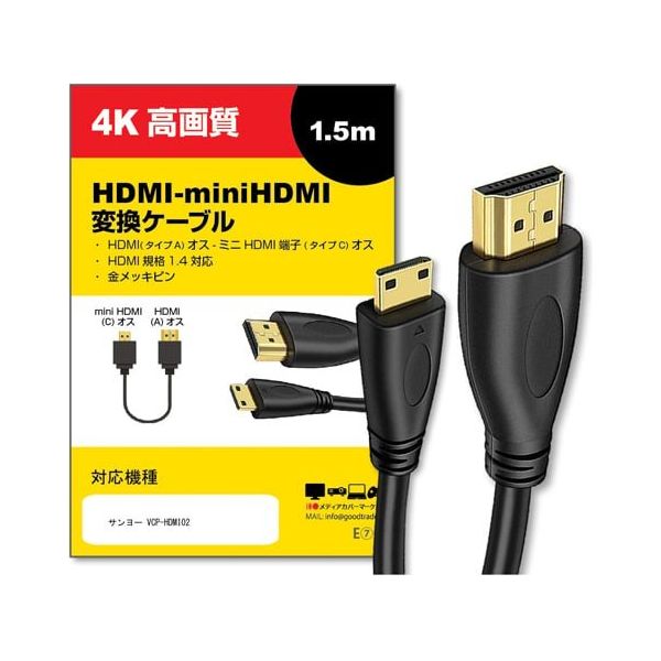 - ●HDMI-miniHDMI変換ケーブル特徴●HDMI(オス)tominiHDMI(オス)変換ケーブルです。MiniHDMI端子を持っているカメラ、テレビ、パソコン、モニター、ゲーム機、ノートパソコン、プロジェクター等に接続できます。映像と音声信号ををデジタルで高速伝送するスーパースリムタイプのイーサネット対応ハイスピードHDMIケーブルです。●ケーブルは端子の耐摩耗性も強く耐久性があるので使用寿命が長いです。●金メッキの端子が経年変化による信号の劣化が起こりにくいです。受信妨害にも避けられます。高品質なPVC外皮、弾性線材で簡単に切断されなくて絡まりにくいです。●HDMI規格1.4対応:1080p(FullHD)と2160p(4K)の高解像度、色深度48bit(ディープカラー)の鮮やかで豊かな映像を楽しめます。3DとHDCPも対応しています。●【対応機種】●SANYO(サンヨー)機種に対応しております。●VCP-HDMI02の互換品としてご使用ください。●※SANYO純正品ではございません。●DMX-CS1●DMX-FH11●DMX-GH1●DMX-SH11●DMX-CG11・DMX-CG100●DMX-CG110●DMX-CA9・DMX-CA100●DMX-WH1・DMX-WH1E●など●すべての対応機種を記載できていない場合がございます。●ケーブルタイプ:HDMI(オス)tominiHDMI(オス)変換ケーブル●長さ:1.5m●コネクタ形状:HDMI(タイプA)オス19ピン-ミニHDMI端子(タイプC)オス19ピン●カラー:ブラック●お使いのデバイスの出力ポートをご確認の上お買い求めください。●当製品は互換品となります。メーカーが販売、製造するものではございません。純正品ではないことをご了承ください。●お客様がご使用されているご観覧環境などによって色味が若干異なる場合がございます。●メーカー都合により、細部のデザイン、サイズ、素材等が予告なく変更される場合がございます。