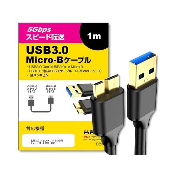 - ●USB3.0MicroBUSBケーブル特徴●USB3.0対応のUSBケーブル(A-MicroBタイプ)(USB3.0/USB3.0Gen1/USB3.20Gen1は同仕様)です。●外付けハードドライブ、USBハブ、スマートフォン、タブレットに接続可能でポータブルUSB3.0ハードドライブにとって不可欠なアクセサリーです。●MicroUSBケーブルはUSB3.0に対応し、従来(USB2.0)規格の10倍以上という「最大5Gbps」(SuperSpeed:理論値)の高速データ転送を実現します。USB2.0との下位互換にもサポートできます。●MicroUSBType-bケーブルはストレインリリーフを成型したコネクターで耐久性にも優れ、人間工学に基づいて設計されたトレッドを採用。ケーブルが簡単に挿抜可能です。また、USBコードは耐腐食性金メッキコネクタなので、より良いパフォーマンスと耐久性を実現します。●USBMicroケーブルは金メッキコネクター、純銅導体と箔&編組シールドの組み合わせでケーブルの性能が高まり、エラーフリーのデータ転送と高速充電速度も実現します。●MicroUSB3.0ポートが搭載のデバイス:SamsungGalaxyS5、GalaxyNote3、GalaxyNotePro12.2、又はポータブルUSB外付けハードドライブ(ToshibaCanvio、SeagateFreeAgent、WesternDigital(WD)MyPassportとElementsharddrivesを含む)などに対応します。●対応機種:【BUFFALO/バッファロー】●ブルーレイ/DVDドライブなど ※すべての対応機種は記載できておりません。●ケーブルタイプ:USB3.0対応USBケーブル(A-MicroBタイプ)●長さ:1m●コネクタ形状:USB3.0(Standard-A)オス-USB3.0(Standard-MicroB)オス●カラー:ブラック●USB2.0MicroBとは形状が違うため併用はできません。