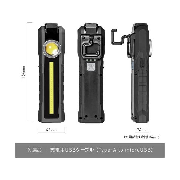 | 商品の特徴 | ●用途に合わせて使い分けできる3つの点灯モード。●約135gの軽量設計で、ポケットにも収まるスリムボディ。●寸法(幅W×高さH×奥行D)(mm):154×42×24 | ||