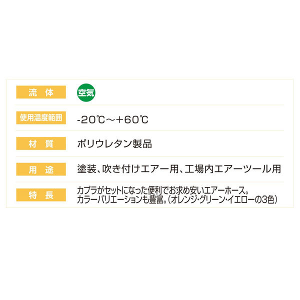 | 商品の特徴 | 吹き付けエアー、工場内エアーツール用のエアーホースです。 | ||