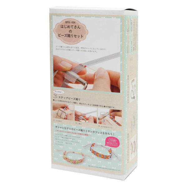 | 商品仕様3 | 用意する物:ピンセット、はさみ、ものさし、テープ | 商品仕様2 | セット内容:ビーズ織り機、ビーズ針、デリカビーズ、ワイヤー、ミサンガブレス用パーツ、たて糸、横糸、ビーズマット、説明書・アクセサリーレシピ |