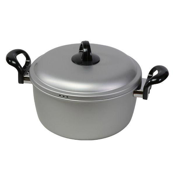 - 表面加工/アルマイト、本体/アルミニウム合金、蓋/アルミニウム合金、取っ手・つまみ/フェノール樹脂(耐熱温度150度)、ハンドルジョイント部/ステンふち巻き