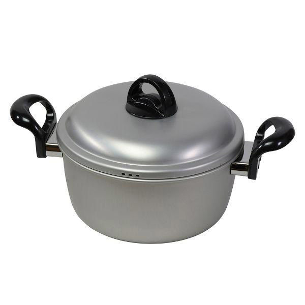 | 食洗機可否 | 不可 | 材質 | 表面加工/アルマイト、本体/アルミニウム合金、蓋/アルミニウム合金、取っ手・つまみ/フェノール樹脂(耐熱温度150度)、ハンドルジョイント部/ステンふち巻き |