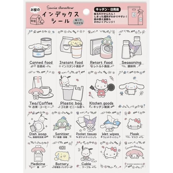 | 商品の特徴 | 様々な収納シーンに使える、サンリオキャラクターを使ったかわいいインデックスシール。目的別に使えます。生活用品、日用品、キッチン用品の分類もかわいく機能的に。水濡れに強いユポ素材を使用し、色落ちしにくいよう、耐光インク使った機能的にも優れたシールです。 | ||