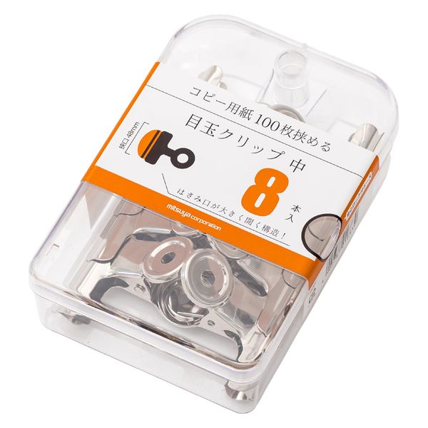 | 商品の特徴 | 定番の目玉クリップの中サイズです。挟み口サイズは、50mm。A4サイズのコピー用紙を約100枚挟めます。書類や袋物を留めたり、取っ手部分に紐を通して吊下げたりと、さまざまな用途にご使用いただけます。 | ||
