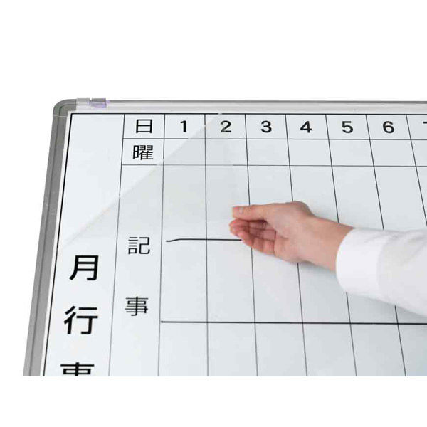 | 商品の特徴 | ホワイトボードのようにホワイトボード用マーカーで書いて消せるシートです。国内フィルム工場製、裏面粘着シール仕様でカッターやはさみなどでカットできます。透明シートのため、スケジュール表など罫線や文字や絵の上から貼って使うことができます。薄手フィルムでありながら強度と耐久性があります。会社、学校、学習塾、施設などに。 | ||
