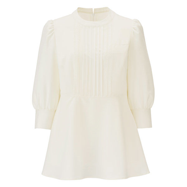 - 後ファスナー(長めの引き手)開き、左胸ペン差しポケット、両脇シームポケット、汗脇パット付き、ペプラムシルエットでボディラインをカバー、家庭洗濯可能