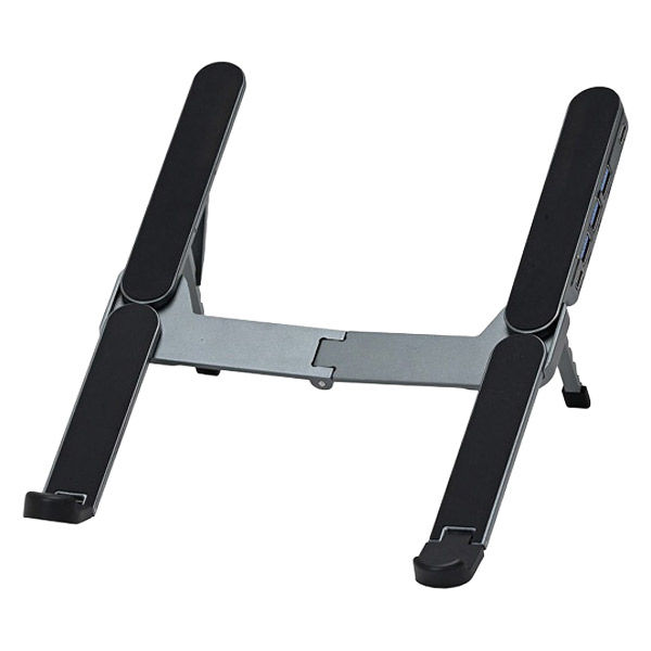 | 商品の特徴 | アルミ製のノートPCスタンド。収納時は鞄に入れても場所を取らないコンパクトサイズです。6段階の角度調整可能。重厚感のあるボディでノートPCをしっかりサポートします。 下方向に軽く振ると背面スタンドが出る仕様。収納袋付属。 Type-C×1、USB3.0規格Type-A×3のUSBポート付き。 | ||