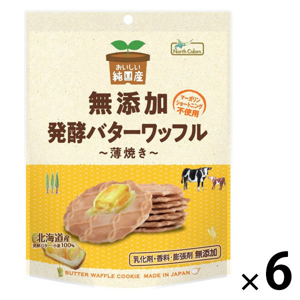 | 商品の特徴 | 北海道産の発酵バターを全重量の21%も使用した風味豊かなワッフルクッキーです。 ノースカラーズのおいしい純国産シリーズは、調味料(アミノ酸) 保存料 着色料 香料を一切使いません。 原材料の全てが国産の贅沢なシリーズです。 | ||
