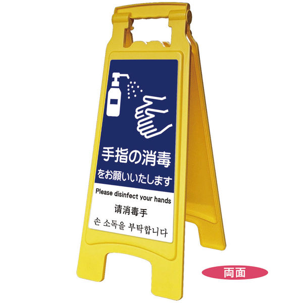 | 商品の特徴 | 開いて置くだけで、簡単に注意喚起ができます。大きな文字で視認性も優れています。丈夫な造りで割れにくく、持ち手部分は手を挟まない構造になっています。両面共に、「手指の消毒をお願いいたします」と表示された吸盤式のシールを貼っています。表記は、日本語・英語・中国語・韓国語です。 | ||