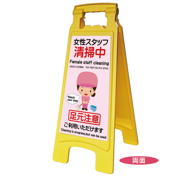| 商品の特徴 | 開いて置くだけで、簡単に注意喚起ができます。大きな文字で視認性も優れています。丈夫な造りで割れにくく、持ち手部分は手を挟まない構造になっています。両面共に、日本語・英語・中国語・韓国語表記の「女性スタッフ清掃中」と表示された吸盤式のシールを貼っています。 | ||