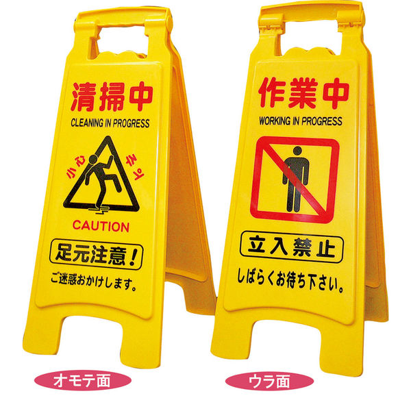 | 商品の特徴 | 開いて置くだけで、簡単に注意喚起ができます。大きな文字で視認性も優れています。丈夫な造りで割れにくく、持ち手部分は手を挟まない構造になっています。表面は「清掃中」、裏面は「作業中」の表示になっています。 | ||