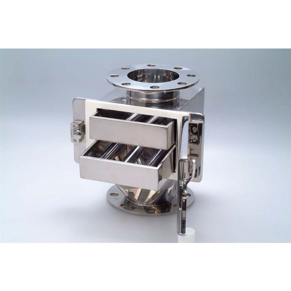- ●パイプ径や処理能力に応じ空気圧送ラインやパイプダクト等に付設し、原材料の粉粒体や化学パウダー等に混入した微鉄粉等を強力磁石にて捕捉させます。●ハウジング前面の開閉式扉よりマグネットを抜出しマグネットに付着した異物を清掃できます。