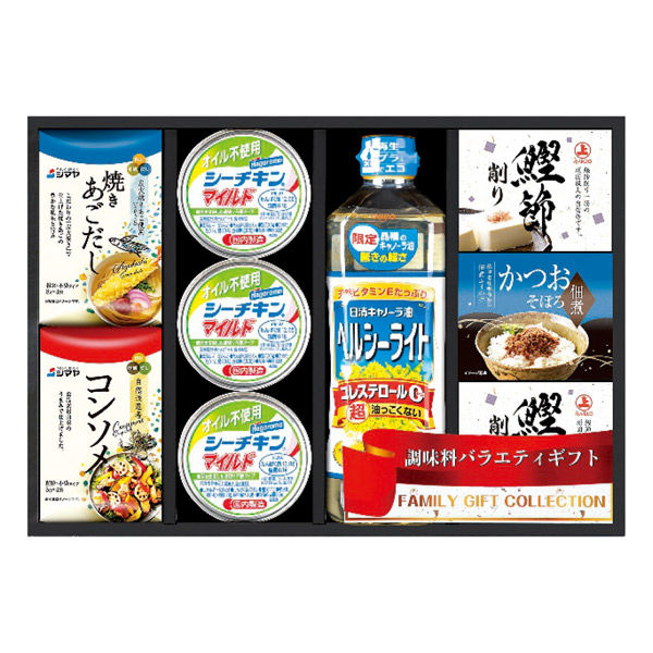 | 商品仕様 | はごろもフーズオイル不使用シーチキンマイルド70g×3缶・鰹節削り(1.5g×2袋)2個・シマヤ焼きあごだし(8g×4袋)・シマヤ自然派思考コンソメ(5g×4袋)・かつおそぼろ佃煮(5g×2袋)各1個・日清ヘルシーライト600g×1本 | ||