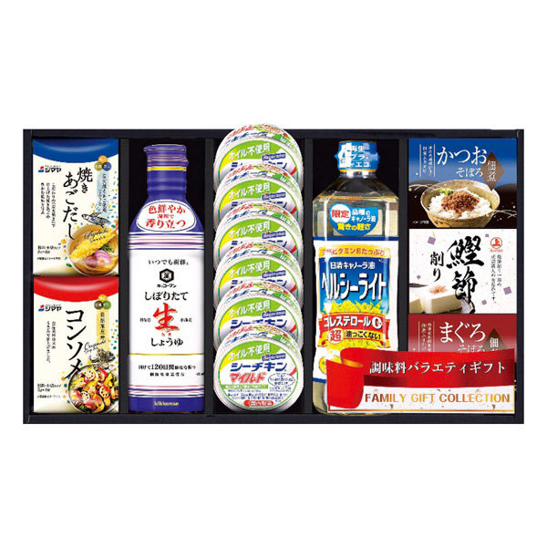 | メーカー名 | 創愛 | 商品仕様 | はごろもフーズオイル不使用シーチキンマイルド70g×6缶・シマヤ焼きあごだし(8g×4袋)・シマヤ自然派思考コンソメ(5g×4袋)・鰹節削り(1.5g×2袋)・かつおそぼろ佃煮(5g×2袋)・まぐろそぼろ佃煮(5g×2袋)各1個・キッコーマンしぼりたて生しょうゆ450ml・日清ヘルシーライト600g各1本 |