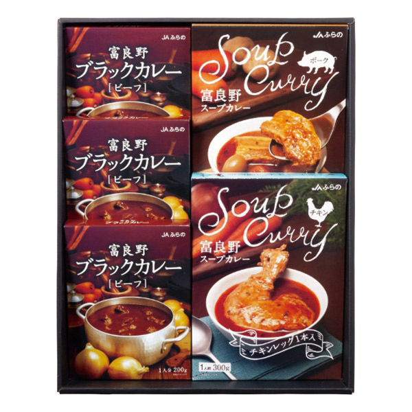 - 富良野ブラックカレービーフ200g×3個・富良野スープカレー(チキンレッグ入300g・厚切り豚バラ肉入260g各1個)