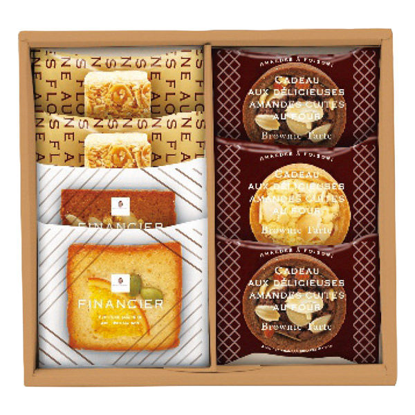 | 商品仕様 | フィナンシェ(オレンジ・キャラメルアーモンド各1個)・タルト(ブラウニー2個・ホワイトブラウニー1個)・フロランタン2個 | 包装 | 包装あり |