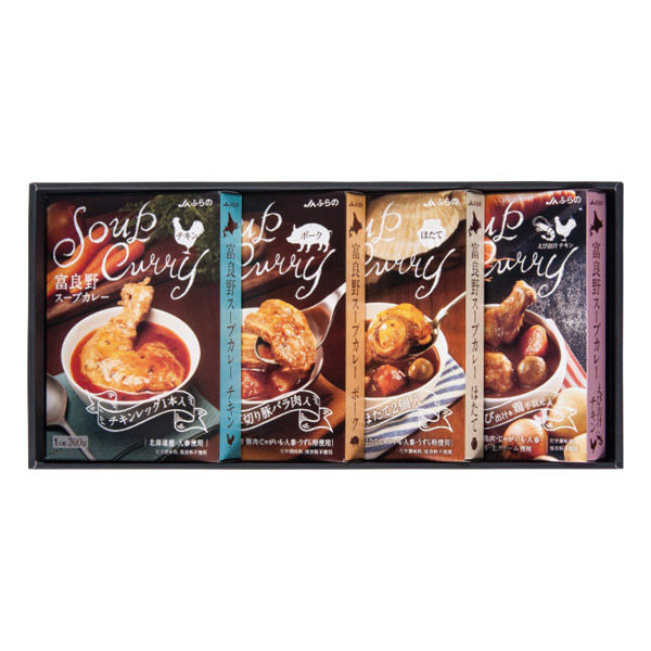- 富良野スープカレー(チキンレッグ入300g・厚切り豚バラ肉入260g・ほたて2個入260g・えび出汁鶏手羽元入260g各1個)