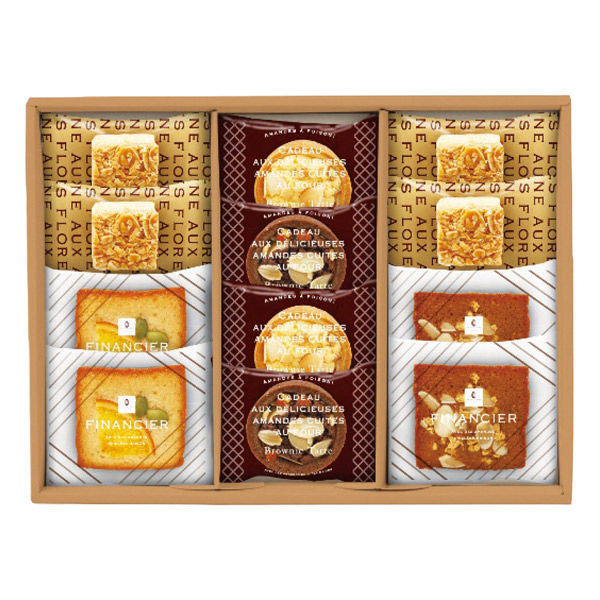 | 質量 | 470g | 商品仕様 | フィナンシェ(オレンジ・キャラメルアーモンド)・タルト(ブラウニー・ホワイトブラウニー各2個)・フロランタン4個 |