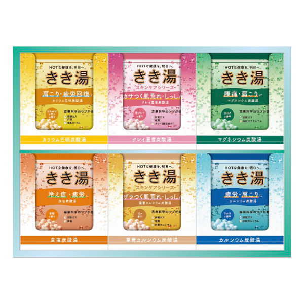 - 30gきき湯(マグネシウム炭酸湯・カリウム芒硝炭酸湯・クレイ重曹炭酸湯・食塩炭酸湯・重曹カルシウム炭酸湯・カルシウム炭酸湯各2個)