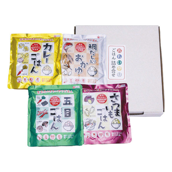 | 商品仕様 | 五目ごはん・カレーごはん・さつまいもごはん・鯛だし入りおかゆ各1袋・各260g・スプーン付 | 包装 | 包装あり |