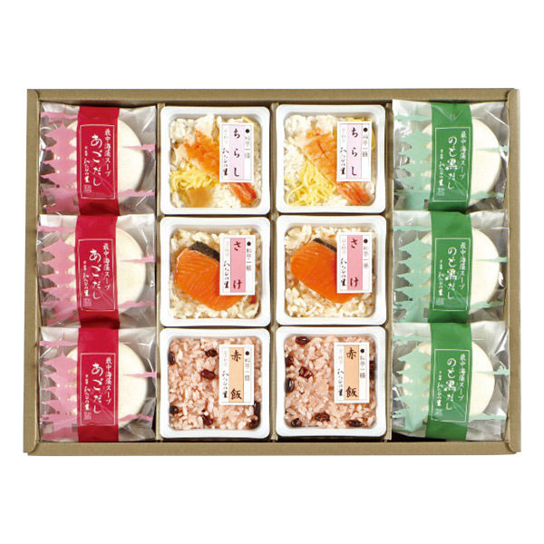 | 包装 | 包装あり | 商品仕様 | 鮭ごはん・赤飯・ちらし寿司各2個・各90g・最中海藻スープ(のど黒だし・あごだし各3個・各8g)・ごましお2袋付 |