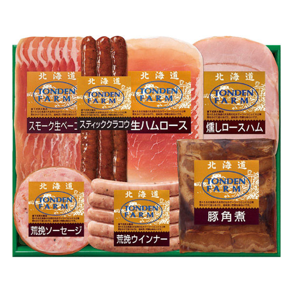 - 生ハムロース(スライス)40g・燻しロースハム(スライス)60g・スモーク生ベーコン(スライス)60g・スティッククラコウ(ソフトサラミソーセージ)80g・荒挽ウインナー100g・荒挽ソーセージ70g・豚角煮160g各1個