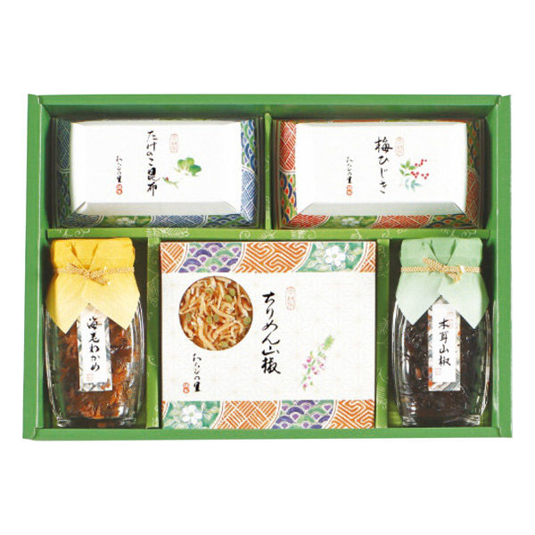 | 商品仕様 | 海老わかめ65g・木耳山椒55g各1瓶・ちりめん山椒40g・たけのこ昆布50g・梅ひじき50g各1個 | 包装 | 包装あり |