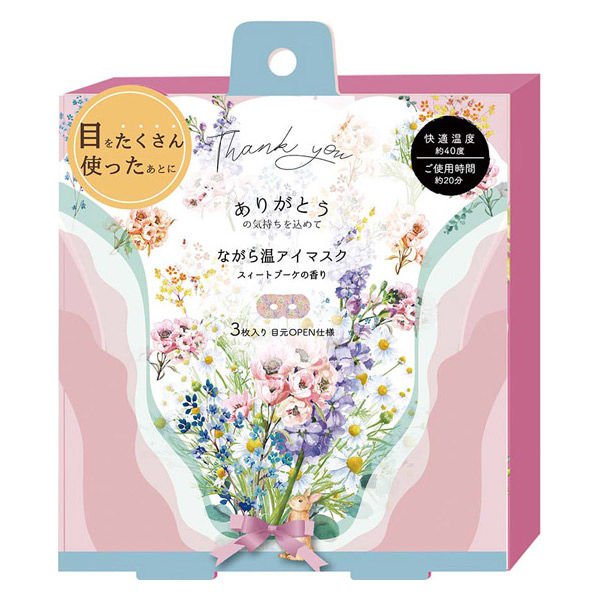 | 商品の特徴 | (1)目の周りにしっかりフィットする形状(2)肌あたりのやさしい、柔らかい不織布を使用(伸縮性もあるため男性の方にも着用いただけます!)(3)まつげをカールした状態でアイケアできちゃう(4)種類豊富なデザイン、ギフトにしやすい可愛いパッケージも魅力的(5)快適温度約40℃のちょうどいい暖かさを約20分間利用できる(6)個包装になっているから、旅行先にも持ち運び便利 | ||