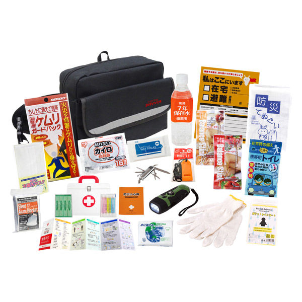 - 収納バッグ・防災の心得・ホイッスル・カイロ・レインコート・携帯用トイレ1P・ケムリガードパック・ダイナモ多機能ライト・軍手・静音アルミブランケット・防災てぬぐい・マスク・7年保存水500ml・バランススティック×2・8徳ナイフ・緊急避難カード・除菌アルコールウェットティッシュ・水に流せるペーパー・救急4点セット