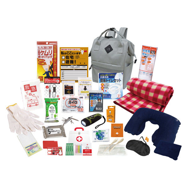 - 収納リュック・防災の心得・IDホイッスル&カラビナリング・カイロ・レインコート・抗菌消臭簡易トイレ3回分・トイレポンチョ・ダイナモマルチライト・トランプ・歯磨きティッシュ・軍手・アルミブランケット・フリースブランケット・救急てぬぐい・マスク・ウェットティッシュ・ネックピロー・アイマスク・耳栓・ケムリガードパック・カトラリーセット・8徳ナイフ・給水袋3L・ソーイングセット・緊急避難カード・水に流せるペーパー・救急4点セット