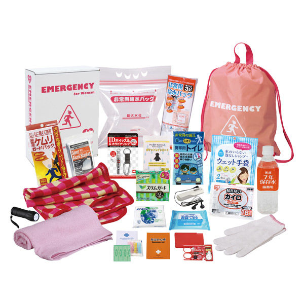 - 非常用持出袋・防災の心得・IDホイッスル&カラビナリング・カイロ・レインコート・携帯用トイレ1P・LEDライト・FMラジオ・軍手・生理用ナプキン(8枚入)・静音アルミブランケット・フリースブランケット・フェイスタオル・ケムリガードパック・綿棒&バンソウコウ・ソーイングセット・7年保存水500ml・給水袋3L・除菌アルコールウェットティッシュ・水に流せるペーパー・ウェット手袋