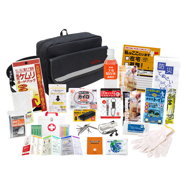 - 収納バッグ・防災の心得・IDホイッスル&カラビナリング・カイロ・レインコート・携帯用トイレ1P・ケムリガードパック・発光スティック・モバイルバッテリー(乾電池式)・FMラジオ・軍手・静音アルミブランケット・防災てぬぐい・マスク・7年保存水500ml・バランススティック×2・8徳ナイフ・緊急避難カード・除菌アルコールウェットティッシュ・水に流せるペーパー・救急4点セット