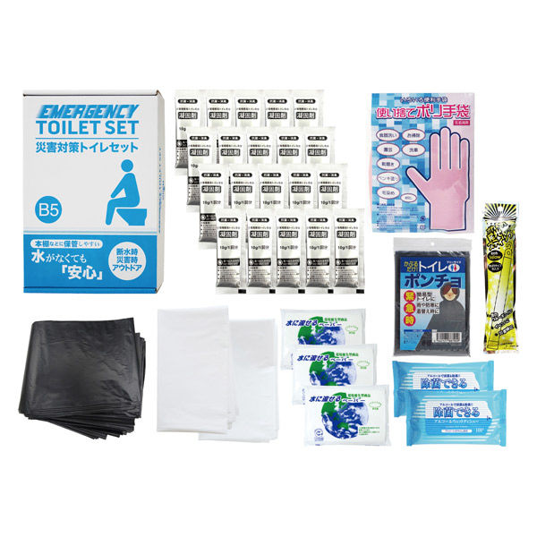 | 商品の特徴 | 水が無くてトイレが使えなくても、排泄物の処理ができる簡易トイレセットです。便座に袋をセットして、排便後に凝固剤(抗菌剤入)を振りかけて固めます。本棚や引き出しに備蓄しやすいB5サイズの箱入りです。災害時・断水時の備蓄に役立ちます。あると便利なトイレポンチョやゴム手袋入り。 | ||