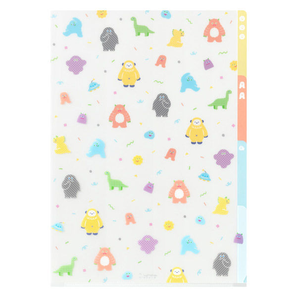 | 商品の特徴 | 右端が大きく開き、書類の出し入れがスムーズな3ポケット仕様のクリアホルダー。用途に合わせ書類をざっくり仕分け。ポケットごとに絵柄が異なり、書類をいれる位置によってデザインの変化が楽しめます。各ポケットにインデックスがついて、用途ごとに分類したり、書類を探したりする際にも目印に。誰でも楽しく分類上手に。書類の分類に最適なA4サイズは、仕事、家庭、勉強・学習と、さまざまなシーンで活躍します。お茶目でユニークなモンスターたちを散りばめた、ポップで楽しいデザインです。 | ||