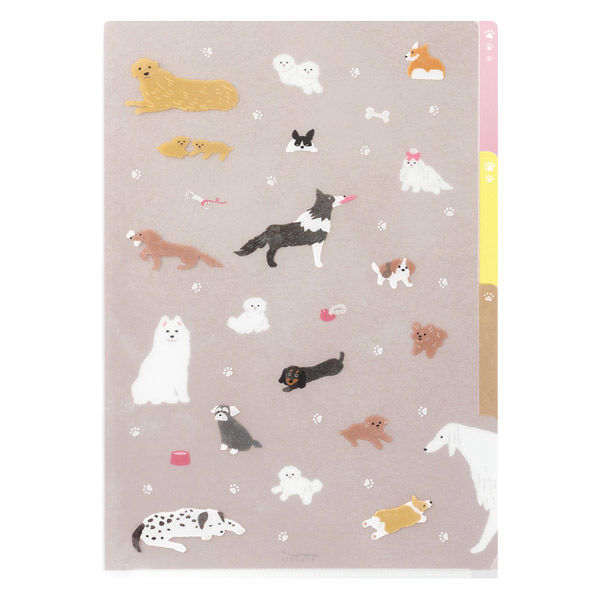 | 商品の特徴 | 右端が大きく開き、書類の出し入れがスムーズな3ポケット仕様のクリアホルダー。用途に合わせ書類をざっくり仕分け。ポケットごとに絵柄が異なり、書類をいれる位置によってデザインの変化が楽しめます。各ポケットにインデックスがついて、用途ごとに分類したり、書類を探したりする際にも目印に。誰でも楽しく分類上手に。書類の分類に最適なA4サイズは、仕事、家庭、勉強・学習と、さまざまなシーンで活躍します。ビションフリーゼ、コーギー、トイプードル等、犬が遊んだりくつろいでいるデザインです。 | ||