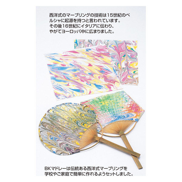 | 商品の特徴 | マーブリングが水の上に表現するのに対し、マドレーは糊状の液の上に表現するもので、マドレー液の適度な広がりと、細密なピーコック模様が表現できます。絵具を浮かすための粉末と、絵具の紙への定着を良くする粉末のセットです。 | ||
