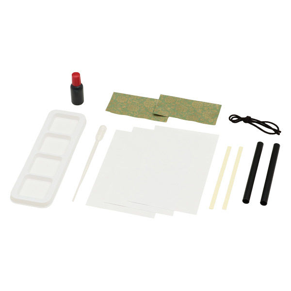 - 枠用和紙:100×50mm、茶紐:約450mm、パイプ:φ10×120mm、画仙紙:100×162mm、両面テープ:131×6mm
